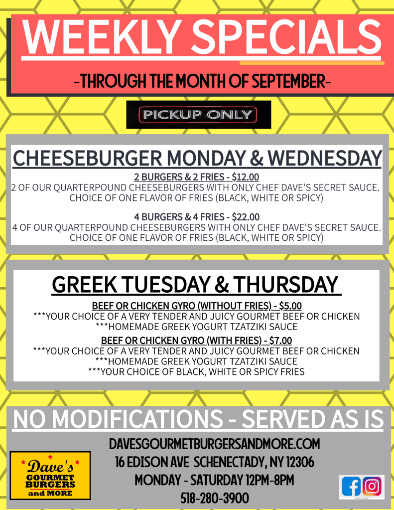Back to the work and school week? Tired after your long 3 day weekend of fun? Don’t want to cook today? Chef Dave is ready to help you out! Don’t forget today is our GREEK GYRO SPECIALS! Also be sure to come check out some sweet treats Chef Dave has available.