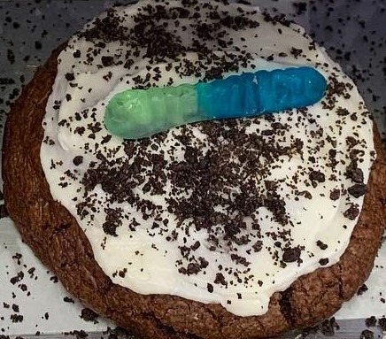 Worms N Dirt- Chocolate base cookie, white chocolate chips, crushed Oreos throughout,, topped with cream cheese frosting , crushed oreos, and a gummy worm!