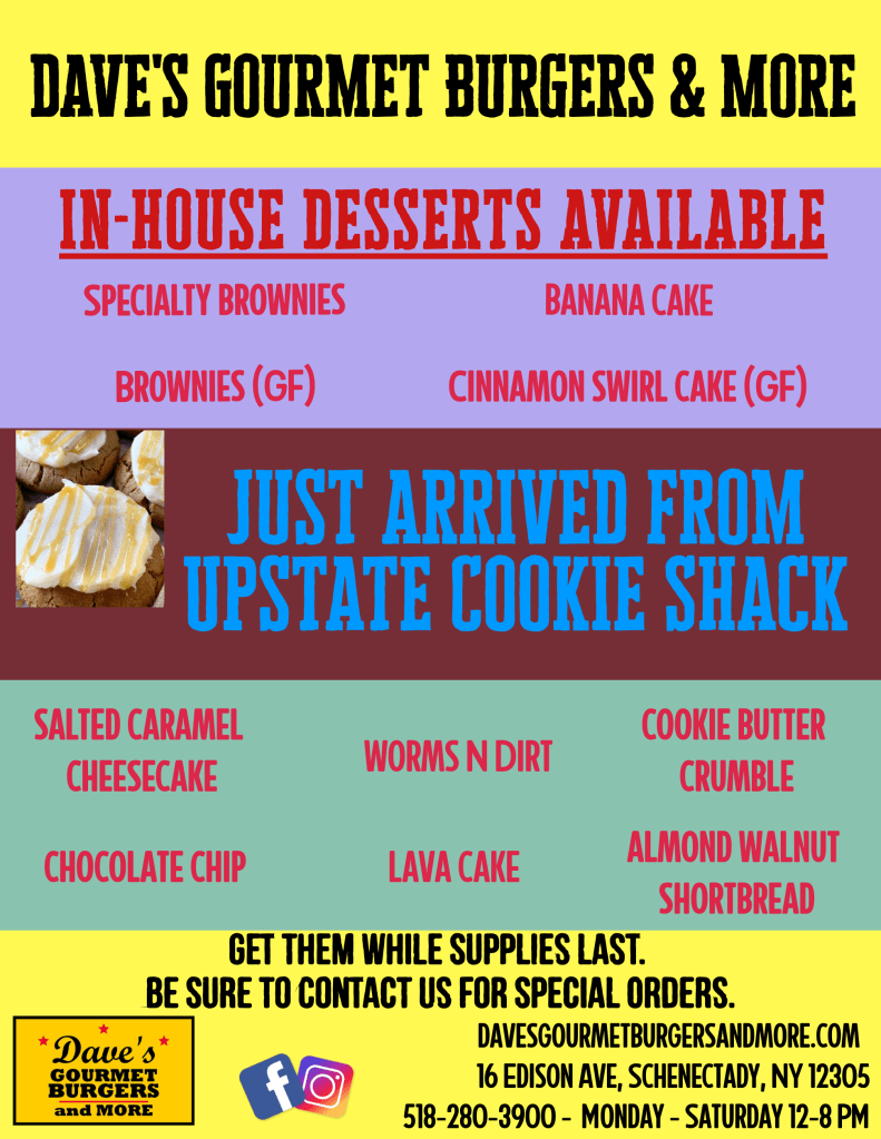 Wednesday’s are for BURGERS! Come and get your weekly burger special (2 Burgers & 2 Fries for $12 OR 4 Burgers & 4 Fries for $22). While your there be sure to pick up a great dessert. We just received a new delivery of Upstate Cookie Shack’s amazing cookies.