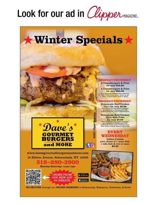 Have you seen us in the new Clipper Magazine? Where are you seeing our ads? We would love to hear your feedback.We are open Monday – Saturday 11am – 7pm. Order online for your delivery or pickup orders. We even have gift certificates available! https://davesgourmetburgers.localfoods2go.com/home
