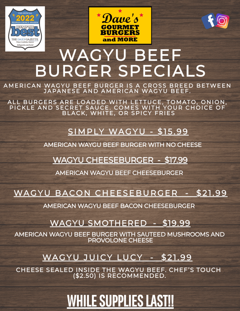 LIMITED TIME OFFER WHILE SUPPLIES LAST! Wagyu Beef Burger Specials available. Chef Dave has created an amazing experience just for you! Get yours today! He is also keeping the New Arrivals another week, so get them while you can.