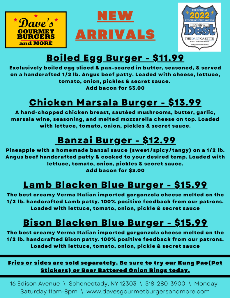 Please consider placing your order for pick up or delivery through our website at: https://davesgourmetburgers.localfoods2go.com/home