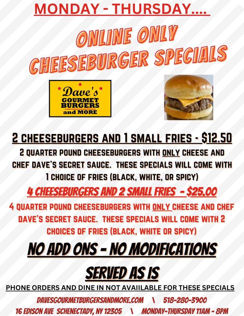 And if you’re craving Dave’s famous Cheeseburger Specials, fret not! These delectable delights are still available for online orders only. Sink your teeth into the juiciest, most flavorful burgers around and experience the satisfaction that only Chef Dave can deliver.