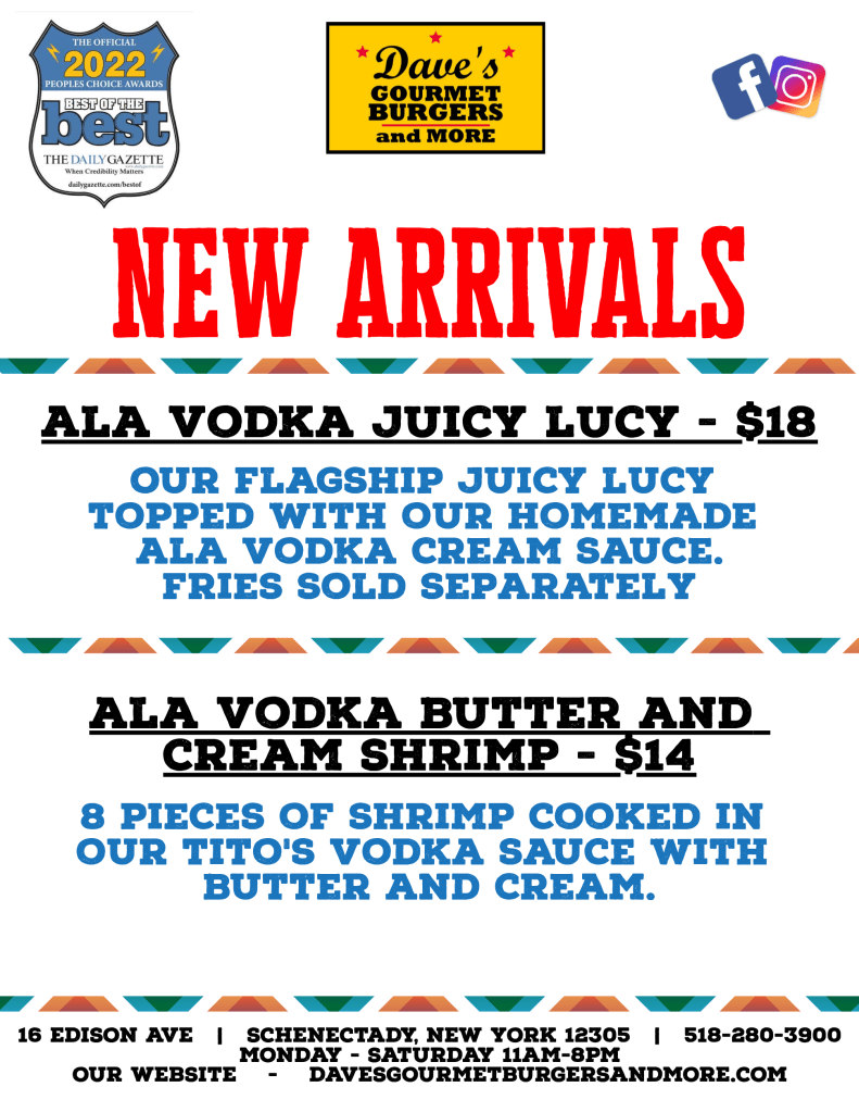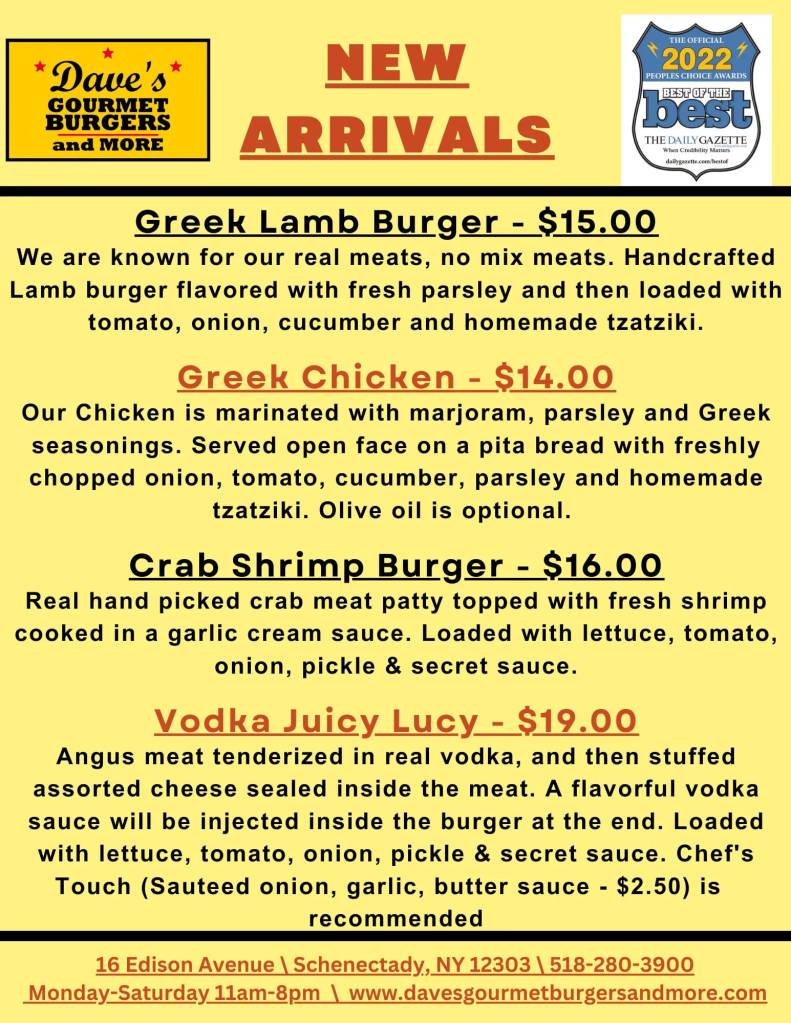 Love Greek food? This week’s specials at Dave’s Gourmet Burgers & More are tailor-made for you! Experience incredible, authentic flavors that will leave your taste buds in awe. Don’t miss our fantastic Vodka Juicy Lucy and delectable Crab & Shrimp Burger also. Order for pickup or delivery at www.davesgourmetburgersandmore.com or join us for a delightful dine-in experience. Enjoy the goodness!